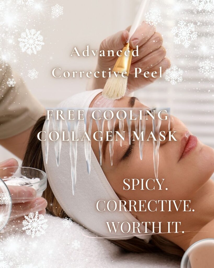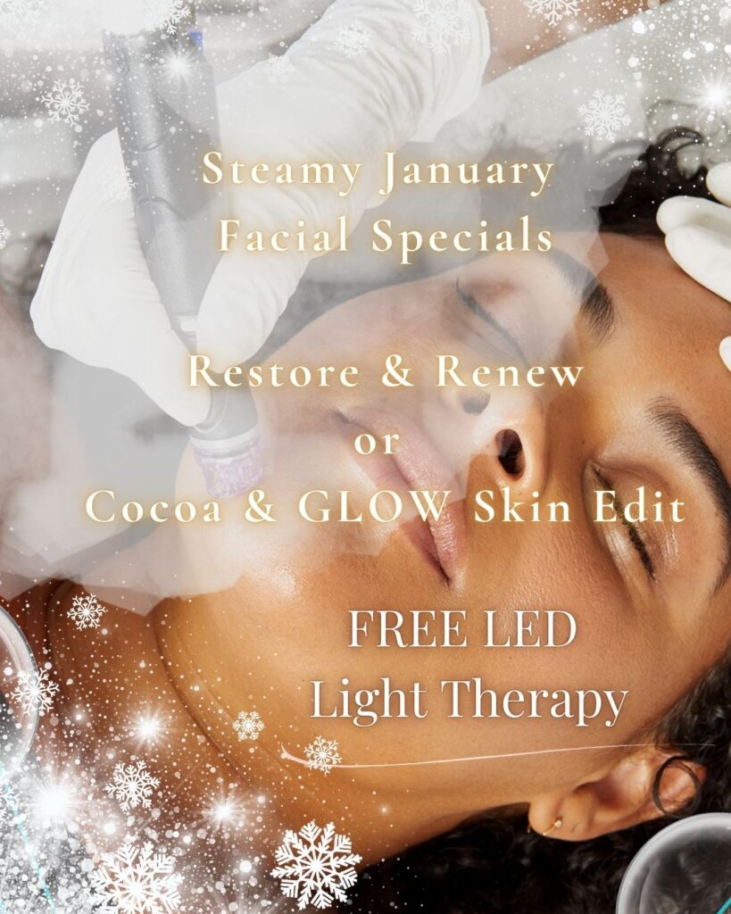 An indulgent winter facial featuring deep cleansing, 20% vitamin C exfoliation, moisture rebalanceing, and a collagen mask finished with red light led therapy. Also includes a cozy cup of hot cocoa or herbal tea.